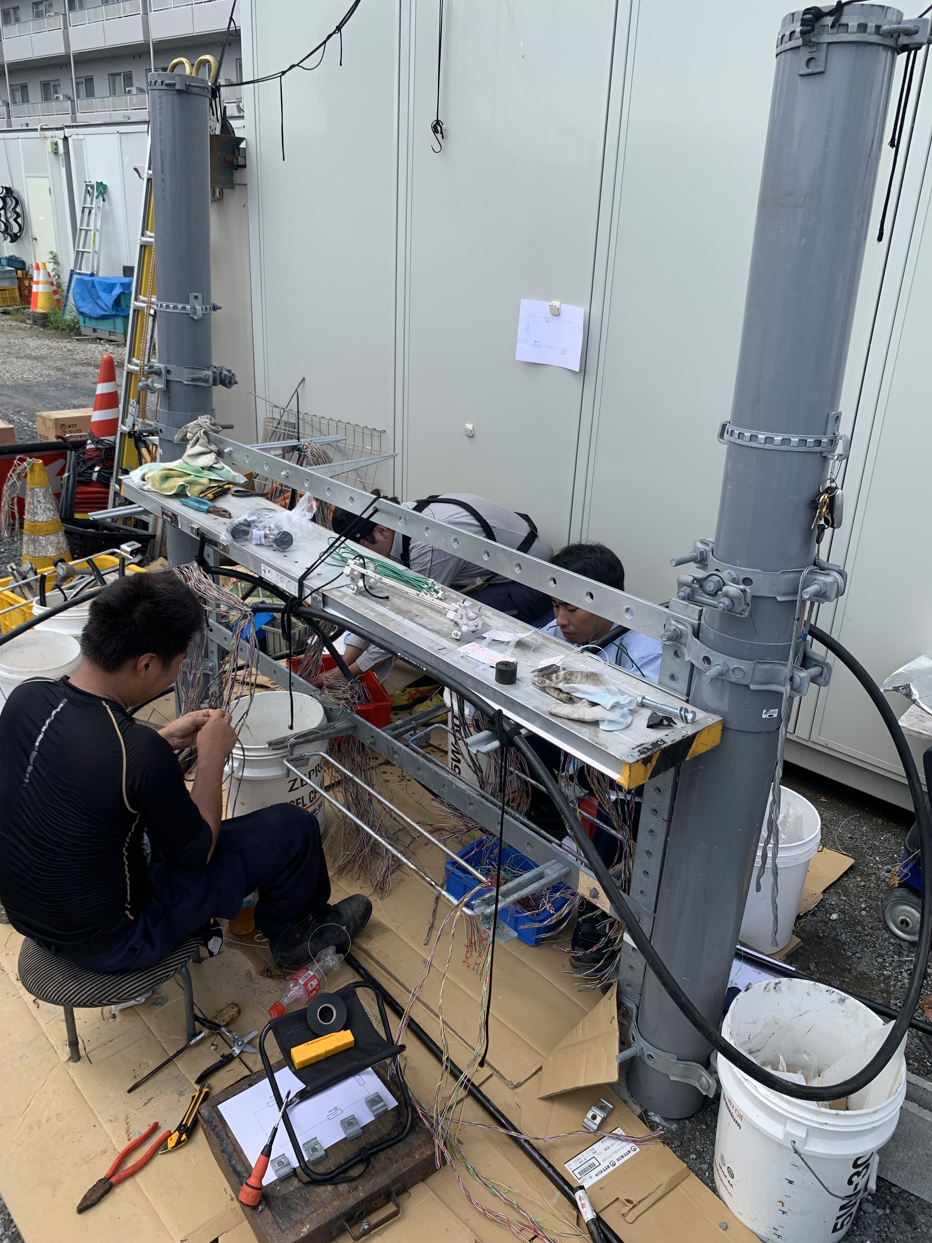 残暑厳しい中での青空教室で地下用メタルケーブルの接続とクロージャーの新設講習を実施しました。中堅の篠原くんが若手を指導しながら皆んな一生懸命にやっていました。成長がたのしみです。長時間の屋外作業につきヘルメットなしについては特別措置