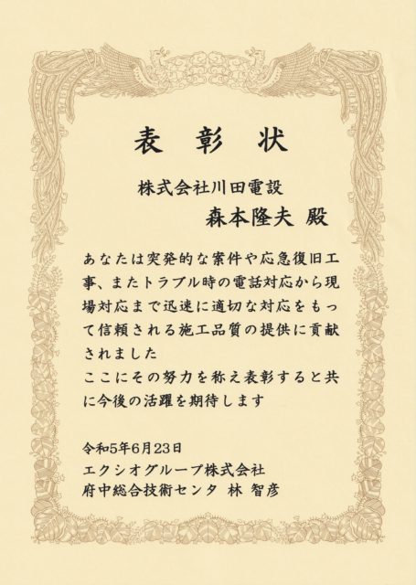 6月23日にエクシオグループ株式会社のゼロ災会議が執り行われました。弊社は前年度の特別奨励として森本君が表彰されました。